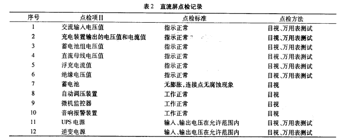 在建立完善的點檢制度之前,首要必須制定契合現場要求,并可以作為依據的設備檢修標準。在直流屏標準中規則了直流電源體系設備檢修的基本要求,檢修前的準備、檢測項目、充放電試驗等內容。直流屏主要由蓄電池.高頻開關電源充電設備,監控設備、絕緣監測設備4部分組成,見表1。