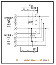 在直流屏中,除了整流器和蓄電池外,還有一個重要的部分,即溝通輸入電源部分。溝通輸入電源是直流屏能否正常供電的前提條件,而一般直流屏所需要的溝通輸入電源,都是由兩路電源組成,一路主用,另一路備用。在主用電源停電時,備用電源主動切換,在主用康復供電時,主動切換回主用。下面介紹一下兩路電源主動切換的原理,主動切換原理圖如圖7所示。三相溝通輸入Al、B1、Cl為1#輸入電源,三相溝通輸入A2、B2、C2為2#輸入電源。正常情況下,即1#、2#溝通輸入電源供電正常時,在1#溝通輸入電源操控回路中,中心繼電器ZJ線圈帶電,使其常開觸點ZJ閉合,一起2#溝通輸入電源回路中的Z常閉觸點斷開,2#溝通輸入電源操控回路中的2#接觸器2CJ線圈不帶電,那么,1#溝通輸入電源操控回路中的2CJ常閉觸點是閉合的。因此,1#溝通輸人電源操控回路中ZJ-2CJ-ICJ回路通電,1#接觸器1CJ的主觸點閉合,l#溝通輸人電源主回路接通,1#溝通輸入電源被接入整流器回路中,供給整流器溝通電源。當1#溝通輸入電源忽然中止時,中心繼電器Z線圈失電,其常開觸點Z翻開,使ZJ-2CJ-ICJ回路斷電,接觸器ICJ主觸點斷開,主回路斷開。而此刻在2溝通輸入電源操控回路中,因為中心繼電器Z線圈的失電,使Z常閉觸點閉合,加之1#接觸器lCJ線圈的失電,使ICJ的常閉觸點也閉合。因此,2溝通輸入電源操控回路中ZJ-ICJ-2CJ回路通電,2m接觸器2CJ線圈帶電,使2#接觸器2CJ主觸點閉合,2#溝通輸入電源主回路接通,2m溝通輸入電源被接入整流器回路中,供給整流器溝通電源。當l#溝通輸入電源康復供電時,2#溝通輸人電源回路中的常閉觸點ZJ翻開,2”接觸器線圈2CJ失電,2接觸器主觸點斷開,切斷了2#溝通輸入電源供電,1#溝通輸入電源又被重新切換回整流器供電回路中去。
