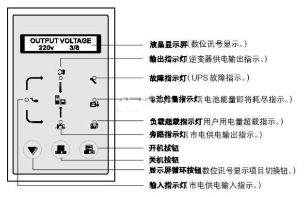(2按一下關機按鍵后,可將ups逆變器關機,改由市電旁路供電。此鍵主要作為ups日常開關機使用。