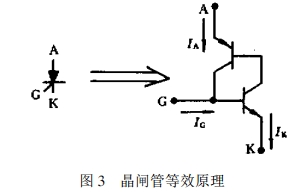 晶閘管的結構相當于串級雙晶體管模型P一N一P一N4層結構,因而具有3個PN結,別離引出陽極A,陰極K,門極G。在圖3結構里不管在PNP和NPN晶體管的A一K端點施加正向電壓仍是反向電壓,其中的P一N一P一N結構都處于高阻阻斷狀況,只經過很小正向漏電流或很小的反向漏電流,與一般二極管的反向特性類似。一旦門極電流Ic注入G點,就會因為形成激烈的正反饋導致PNP和NPN進入完全飽滿狀況,即晶閘管飽滿導通。