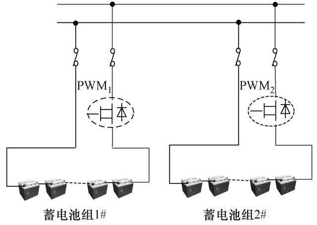 在并聯保護器中的直流屏與蓄電池組之間接入IGBT(insulated gate bipolar transistor),通過PWM電路控制充電電壓和充電電流大小,對充電電流進行限制。兩組蓄電池通過并聯保護器并聯連接時,其充電通道并聯等效電路如圖3所示。